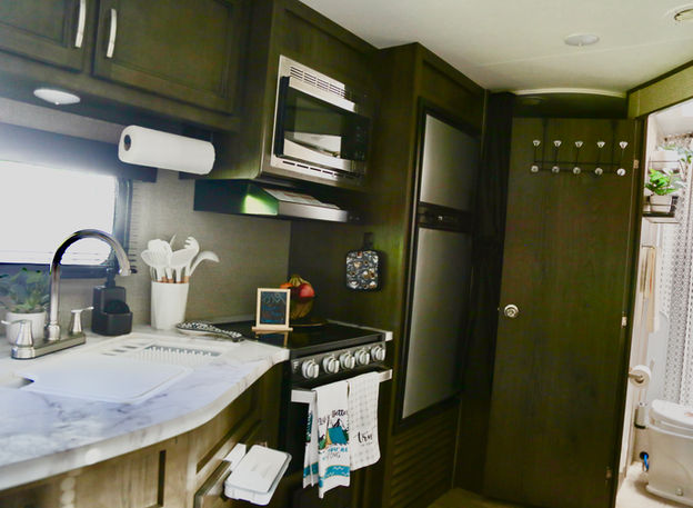 - The RV comes with easy-to-use features like a *three-burner stove*, *microwave*, and *refrigerator* that make cooking on the go a breeze. Plus, the *bathroom* and *showers* are designed to provide convenience without sacrificing space..